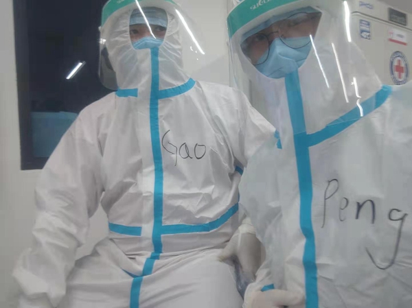在火神山医院刚建好时,检验设备有待完善,彭俊潇与团队得到消息后迅速赶往医院检验区装机实验。没有空调、没时间喝水,团队人员穿着防护服在检验区一待就是10多个小时。
